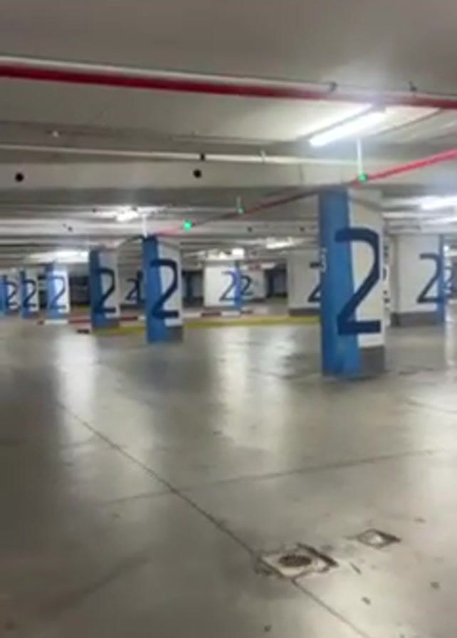 interior of a large, mostly empty parking garage. Rows of white columns painted with a large blue number "2" support the ceiling. Red pipes run along the ceiling, and there are overhead lights. The floor is grey concrete. The camera slowly moves forward between the rows of columns. The video is shot with a slight upward tilt. The scene is lit with bright, artificial light.