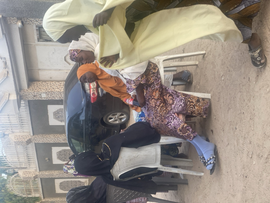 Four women wearing Islamic clothing sit on white plastic chairs outdoors. One woman in black is partially obscured. Another woman wears a white headscarf and a brown and purple floral patterned dress, holding a child in orange. A third woman in yellow stands behind them. A black car is parked nearby. The ground is sandy. A building with a tiled facade is visible in the background.