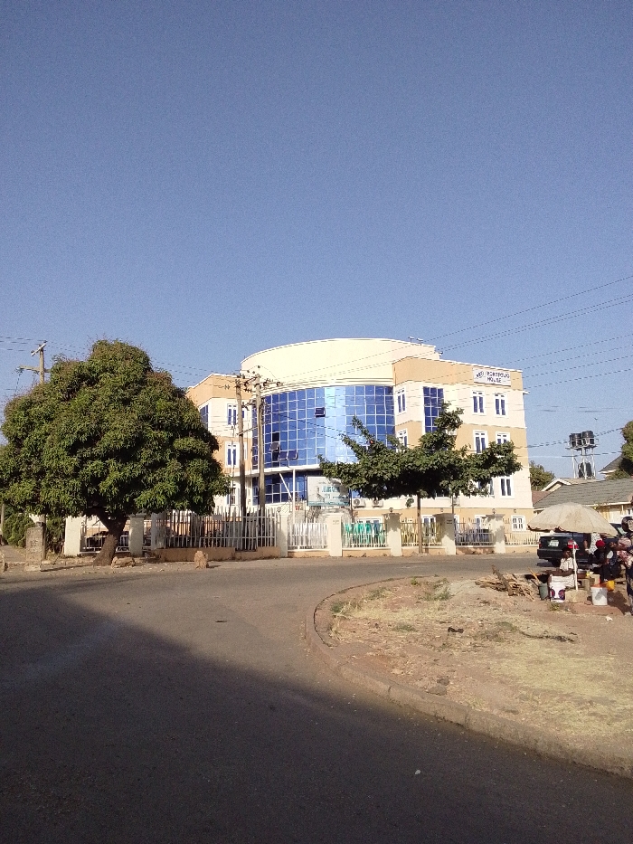 A three-story building with a curved roofline and blue reflective windows is centered in the frame