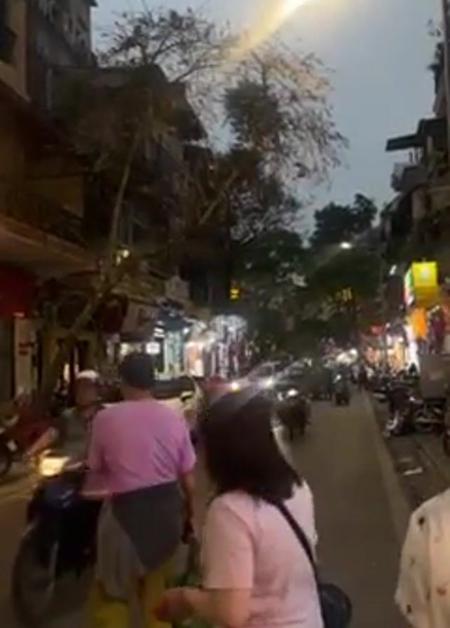 A street scene in Hanoi, Vietnam, is shown. The street is narrow, with buildings on either side that have shops and businesses at street level. Pedestrians are walking on the sidewalks and street, and cars and motorcycles are driving down the road. The sky is overcast. The ground appears to be wet. A large tree with bare branches hangs over the street. Streetlights are on.