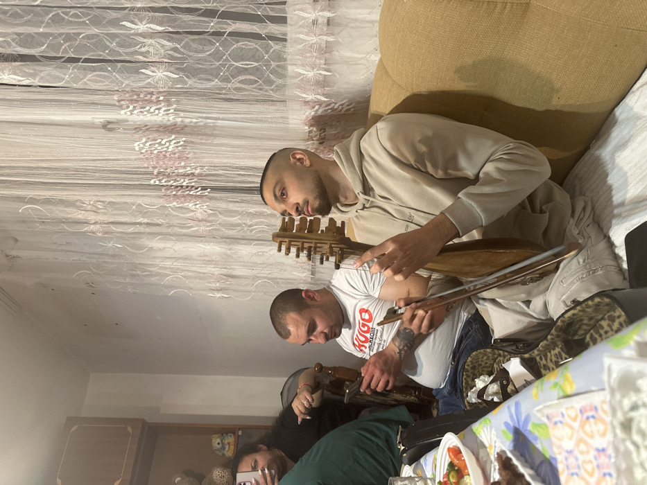 This image depicts an indoor scene in Marinka, Bulgaria, featuring three individuals and various household objects. In the foreground, to the right, a male with short, faded hair and a trimmed beard is seated on a light brown upholstered sofa. He is wearing a light beige hooded sweatshirt and light-colored pants. He holds a traditional wooden stringed instrument, possibly a Bulgarian gadulka, upright in his lap with his left hand, and a bow in his right hand. His gaze is directed upwards and to the right, beyond the frame. To his left, in the mid-ground, another male is seated, wearing a white t-shirt with a red "HUGO" logo and blue jeans. Tattoos are visible on his left arm. He is looking downwards, holding a smartphone with both hands, appearing to be engaged with the device. Partially visible in the left background is a female with dark hair, wearing a dark top. She holds a white smartphone vertically with her right hand, pointed towards the left, suggesting she is capturing an image or video. A table covered with a white and blue floral tablecloth is present in the lower-left quadrant, displaying dishes containing food, including a salad with tomatoes and olives, and a white dip. A black case with leopard-print lining is visible on the floor beneath the table, near the instrument. In the far left background, a dark brown wooden cabinet with multiple shelves holds various items, including stuffed animals and small decorative objects. The background features a wall covered by white, sheer curtains with pink woven patterns. The lighting appears to be artificial.