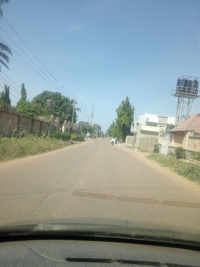 An image captured from within a vehicle, showing a dusty dashboard and windshield at the bottom. The scene depicts a straight, unmarked paved road receding into the distance in an unidentifiable street in Unknown, Unknown. On the left, a high concrete wall topped with barbed or razor wire runs parallel to the road, backed by dense green trees and vegetation. Utility poles with multiple power lines are visible above the wall. On the right, the roadside features sparse vegetation, partially constructed grey concrete block buildings, and a building with a brown tiled roof. A tall metal water tower supporting several black water tanks stands prominently on the right. In the far distance on the right side of the road, two individuals are visible; one appears to be operating a motorcycle with a passenger. The sky is clear blue with minimal cloud cover, indicating daytime conditions.