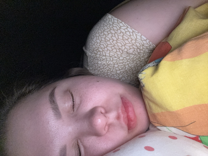 An image, ostensibly captured indoors in Nizhnekamsk, Russia, displays a close-up, angled view of a single individual, appearing to be an adult female, in a state of repose. The subject's head is positioned in the lower-left and central portion of the frame, tilted slightly to her right. Her eyes are closed, and her lips are slightly parted, displaying a reddish hue. Her skin appears fair with visible pores. Dark hair is visible around the upper left side of her head. She is wearing a light-colored garment with a beige/tan geometric pattern, visible on her upper arm and shoulder in the upper-center. The individual's head rests on a white pillow adorned with red polka dots, partially visible in the lower-right. To her immediate right, a brightly colored pillow is present, featuring horizontal stripes in yellow, orange, red, and light blue. A dark, featureless background occupies the upper-left quadrant of the image. No specific visual cues within the image definitively confirm the stated geographical location of Nizhnekamsk, Russia.