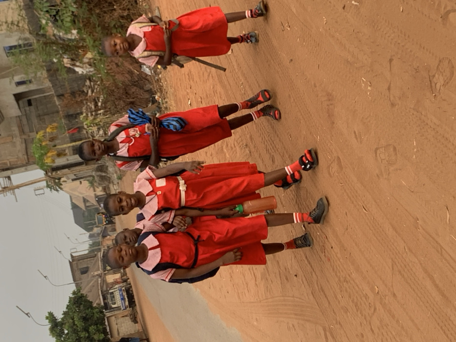 Four schoolgirls in red uniforms walk down a dirt road. They wear backpacks and matching red and white socks. The setting appears to be a developing area with simple buildings and foliage visible in the background. The road shows signs of vehicle traffic. The lighting suggests either early morning or late afternoon.