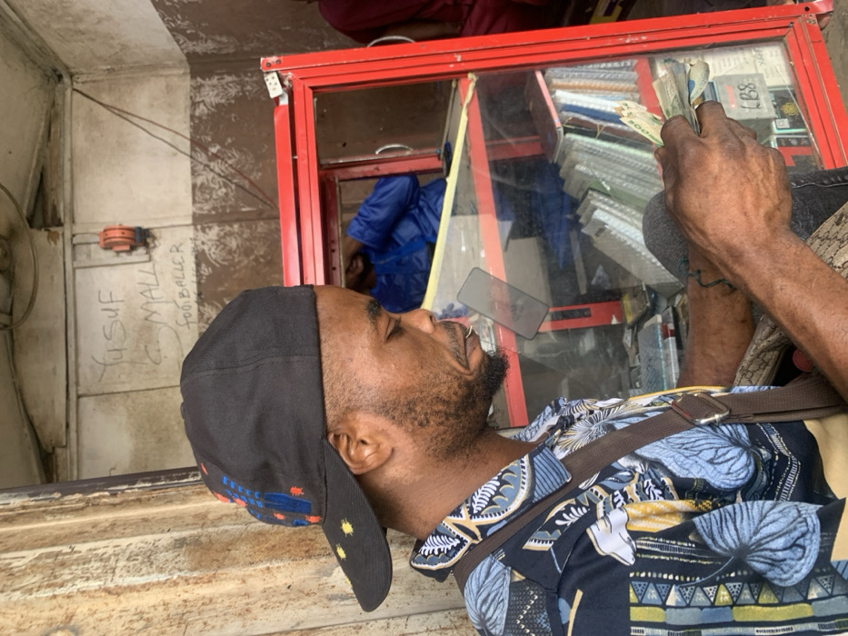 This image depicts a man counting money in what appears to be a commercial establishment in Okene, Nigeria