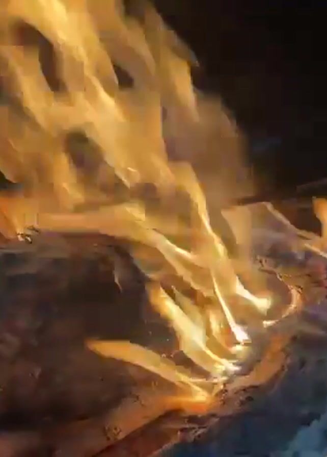 A close-up video shows flames flickering and rising from a campfire, with the dark background indicating it is likely night