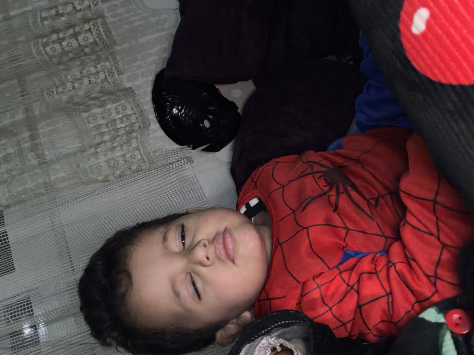 A child in a red Spider-Man costume lies on a patterned surface. A black mask rests nearby on a dark purple blanket. A red and black object is also present. The child's eyes are closed, and their face is relaxed. The scene appears to be indoors and perhaps depicts the child resting or sleeping in costume.