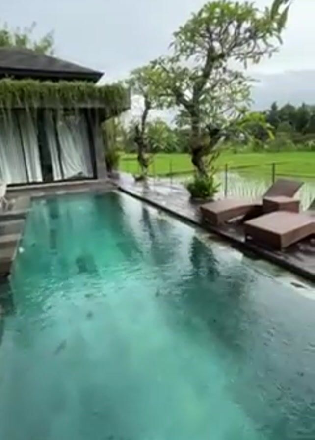 swimming pool next to a building with open sliding doors, and beyond the pool is a wooden deck that overlooks rice paddies. The pool water appears a greenish color and there are sun loungers on the deck. The scene is overcast, with the sun obscured by clouds, and it appears to be raining or has recently rained as the deck and surrounding surfaces are wet. Beyond the rice paddies, palm trees and other vegetation can be seen in the distance. No people are visible in the video. The camera pans slowly across the scene.