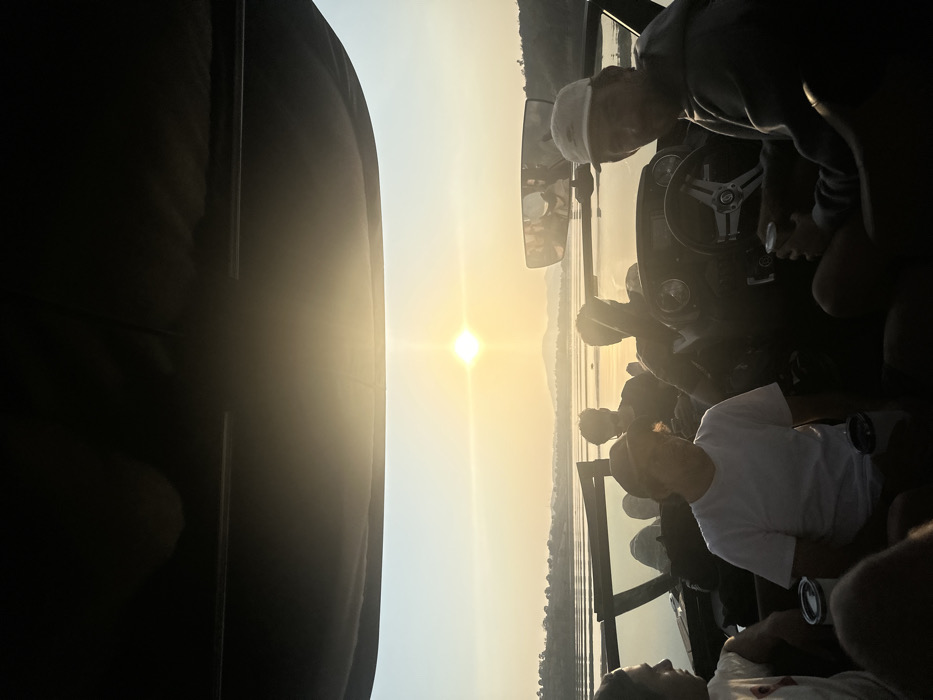 A group of people are on a boat, silhouetted against a bright, hazy sun. The driver steers the boat with a silver steering wheel. Passengers sit and stand, some holding drinks. The sun reflects off the water and casts a golden glow on the landscape. The shot is taken from inside the boat, with a part of the boat frame visible on the left. The composition is simple, focusing on the contrast between the subjects and the bright background.