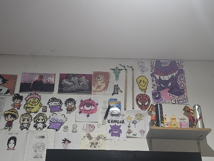 A wall is covered with an assortment of drawings, prints, and pixel art. Anime characters such as Goku and Luffy are visible. There are also drawings of Pokemon, notably Gengar, and a pixel art Spider-Man. A small shelf holds various items including cans, small toys, and figurines. The overall impression is a collection of artwork and memorabilia.