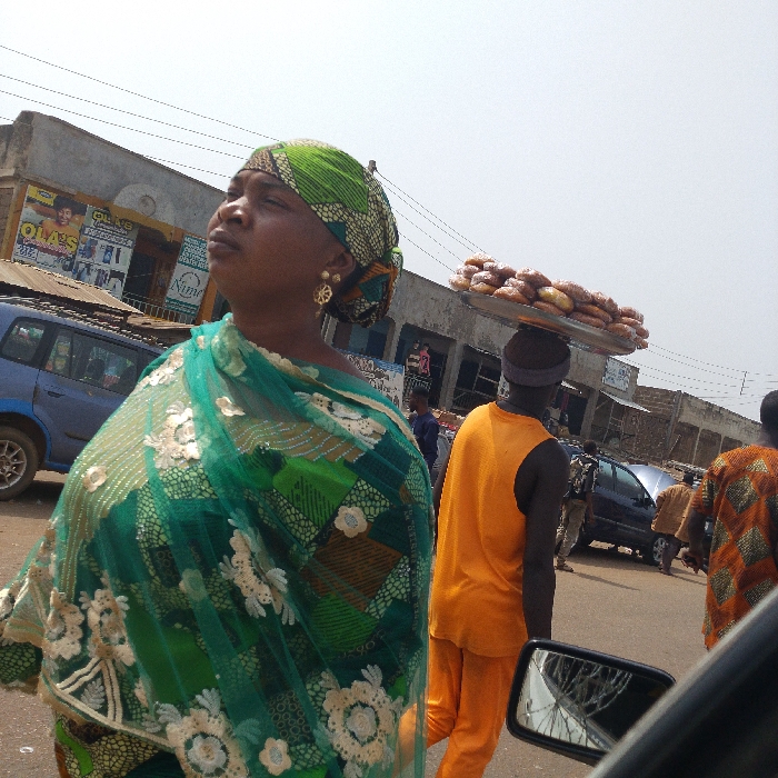 The image depicts a vibrant street scene in Olomoda, Nigeria, under a bright, clear sky. In the left foreground, a woman with dark skin is shown from the chest up, looking slightly upward and to the right. She wears a green patterned headwrap and a green patterned garment, layered with a sheer green fabric adorned with white floral embroidery. Gold-colored hoop earrings are visible on her ears. To her left, the front portion of a blue car is parked. In the midground, a man with dark skin walks away from the camera, balancing a large, round silver tray piled with numerous light brown baked goods on his head. He is dressed in an orange tank top and matching orange trousers, with a dark band around his head. Other individuals are partially visible further down the street, including one on the far right wearing an orange and brown patterned garment. The background features a street lined with single to two-story buildings, some with corrugated metal roofs and visible signage, including "OLAS" and a partial "Nimi" sign. Overhead electrical wires are strung across the scene. Vehicles are present on the street, suggesting an active commercial area.