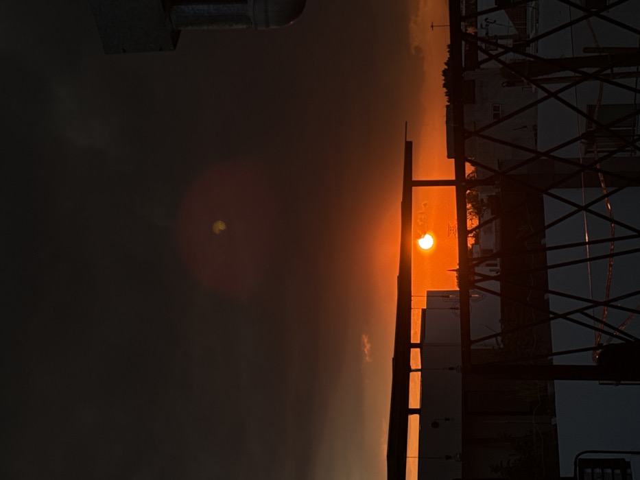 An orange solar eclipse peeks through a rectangular frame against a dark sky. A building and metal structure partially obscure the view. Lens flare appears as an orange circle in the dark sky. The sky transitions from dark to lighter orange towards the horizon, obscured by the frame. Buildings and structures appear silhouetted against the bright light.