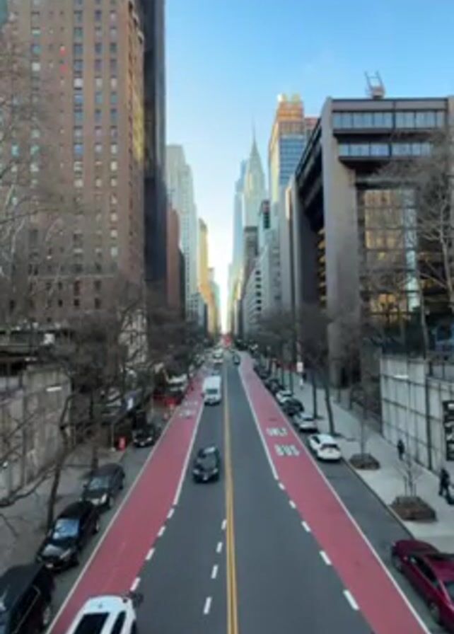straight, wide city street with tall buildings on either side. The road has a central section for regular traffic and dedicated lanes painted red on either side, marked "ONLY BUS". Cars are traveling in both directions on the main road, and several buses are in the bus lanes. Some cars are parked along the curb on both sides of the street. Bare trees line the sidewalks. The sky is clear and blue.