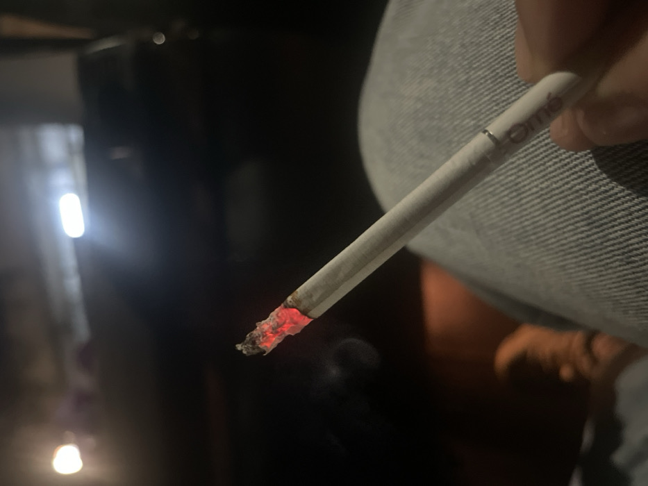 The image presents a close-up, dimly lit scene. A white cigarette is held diagonally across the frame, positioned from the lower right to the upper left. Its tip is actively glowing red with orange embers, and a small amount of grey ash has formed. A faint wisp of smoke or vapor is visible emanating from the left side of the glowing tip. Near the filter end of the cigarette, a silver ring is present, and the partial word "omó" with an accent over the second 'o' is visible on its side. The cigarette is held by a person's fingers, visible on the right side of the stick. The individual is wearing light blue denim jeans, which occupy the lower-right and central portions of the image, displaying a visible weave texture. The background is dark and out of focus, containing several blurred, bright light sources in the upper section. An indistinct, dark reddish-brown object or surface is partially visible in the lower-left background. The scene is located in Slavyanovo, Bulgaria.