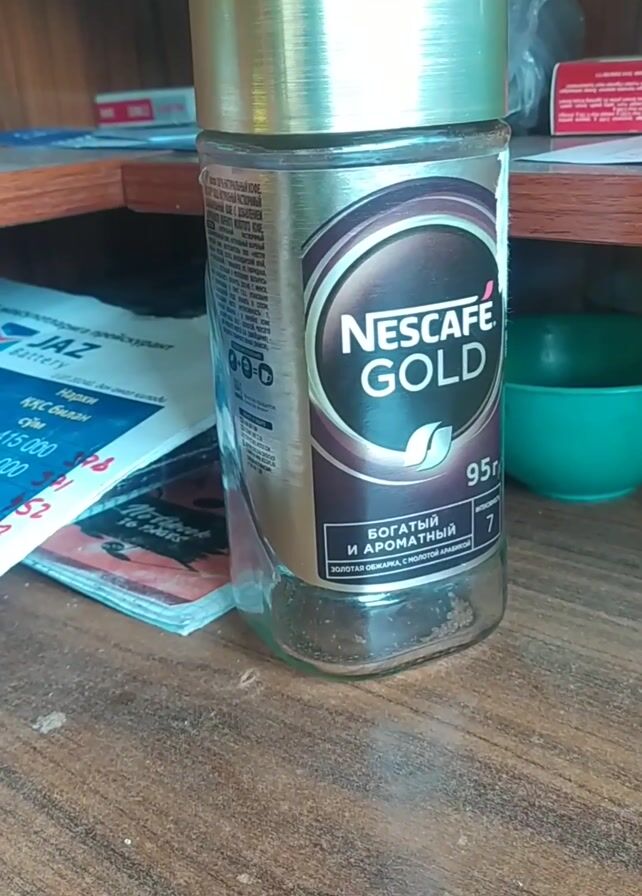 A close-up shot shows a nearly empty jar of Nescafe Gold instant coffee sitting on a dark brown wooden surface