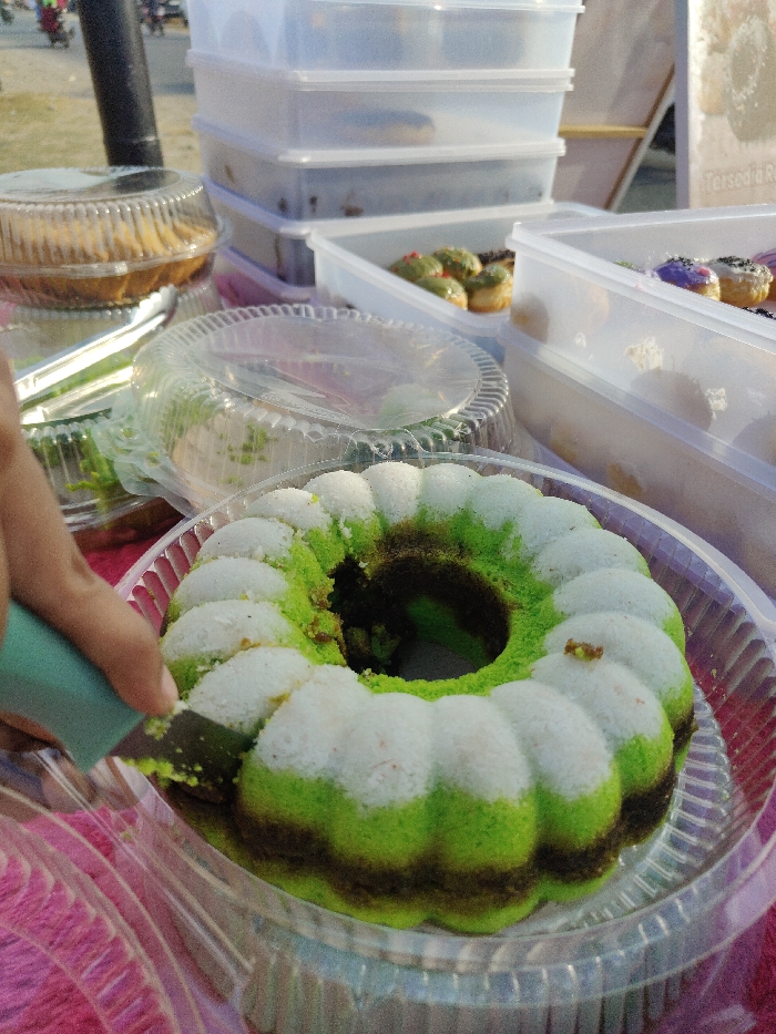 A close-up, eye-level photograph captures a food vendor's stall in Gampongpaya, Indonesia, displaying various baked goods. In the immediate foreground, a light-skinned hand, entering from the left, holds a light-blue handled knife, actively cutting a portion from a ring-shaped cake. This cake, presenting fluted edges, features a distinct three-layered color pattern: white on top, a vibrant green in the middle, and a dark brown at the base, all contained within a clear plastic, ridged serving dish. Behind this central cake, an assortment of other baked items is visible. To the left, a clear plastic domed container holds a golden-brown cake. In the center and right midground, multiple clear rectangular plastic containers are stacked and arranged. These containers hold various donuts; one clearly displays several donuts topped with green icing, while another shows donuts with purple and dark-colored icing. A partial white sign with the Indonesian word "TERSEDIA" (meaning "AVAILABLE") is discernible on the far right. Silver serving tongs are also present in the midground. The items rest on a surface covered by a pink/red textured material. The background is out of focus, revealing a dark vertical pole on the left and blurred shapes consistent with vehicles (motorcycles) and people, indicating an outdoor, possibly roadside or market, setting.