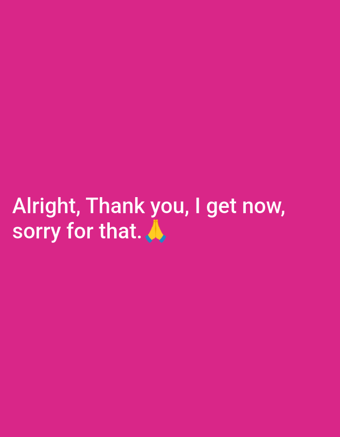 A magenta background displays the text "Alright, Thank you, I get now, sorry for that