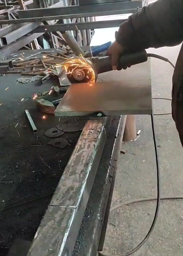 An individual is shown using a power tool to grind a flat piece of metal. The person is wearing a dark-colored jacket and stands to the right of the metal surface they are working on. The metal piece is resting on a metal table that appears to be somewhat dirty and covered with metal scraps. The power tool emits sparks as it grinds the metal. The sparks spread out in various directions around the metal piece, landing on the table and the surrounding floor. In the background, there are various metal structures and tools, indicating that this is likely a workshop or metalworking area. A vehicle is visible in the background through an opening in the workshop. The floor of the workshop is a light grey concrete.
