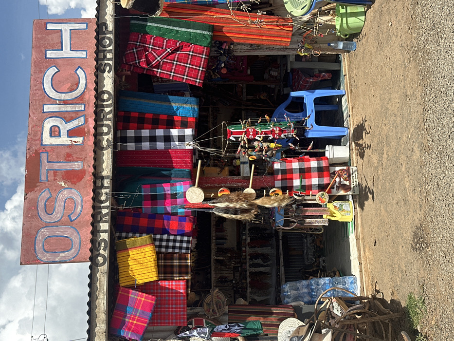 The image depicts the exterior of a roadside curio shop identified by a weathered red sign with "OSTRICH" in white lettering and "OSTRICH CURIO SHOP" in black letters on a white band, situated beneath a corrugated metal roof. The shop is located in Lari/Kirenya ward, Kenya. The storefront is open, revealing an interior with shelves displaying various items, including what appears to be beaded necklaces and other small crafts. The back wall of the shop's interior consists of corrugated metal sheeting. The entrance and overhang are extensively adorned with merchandise. Numerous colorful textiles, predominantly plaid (red, blue, black, white) and striped patterns, are suspended from the shop's front structure. Other items include two large bundles of what appear to be animal fur attached to wooden sticks, a circular woven item, and a hanging mobile featuring multiple small, brightly painted wooden birds and red, green, and white elements suggestive of the Kenyan flag. Directly beneath the fur items, several necklaces are displayed. A yellow plastic container and a small sign with text are visible on the ground directly in front of the shop. To the left of the entrance, a worn wooden chair and several large, stacked plastic water bottles are present. To the right of the entrance, a single blue plastic chair is positioned. Further right, a green plastic bucket and another plastic water bottle are visible. The ground in front of the shop is unpaved, consisting of dirt and gravel. Shadows from overhead objects or structures are cast on the ground, indicating direct sunlight from a high angle. The sky above the shop's roof is partially cloudy. No individuals are visible in the scene.