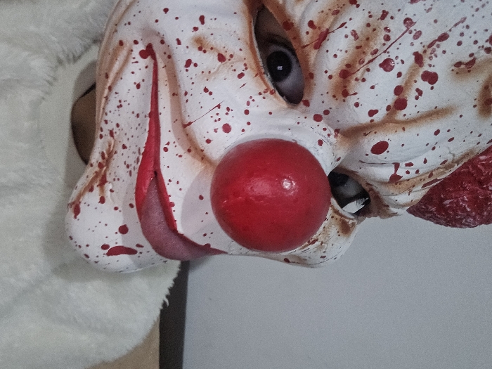 The image features a sinister clown mask, splattered with red, resembling blood. The mask is predominantly white, with a bulbous red nose and red accents highlighting the mouth and possibly other features. One eye of the person wearing the mask is visible, looking unsettling. A fluffy, white costume element is visible to the left, possibly part of the clown suit.