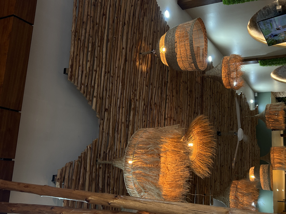 Wicker light fixtures hang from a ceiling covered in vertical wooden strips
