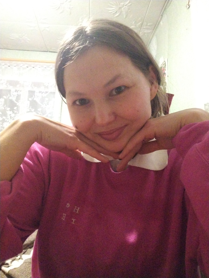 A young adult female is depicted in a close-up, chest-up shot, facing the camera directly and smiling. She has light skin, dark eyes, and medium-length brown hair. She is wearing a magenta or pink long-sleeved top with a white collar visible beneath. Her hands are positioned under her chin, with her fingers clasped and resting on her jawline and lower face. On the left chest area of her top, faint, light-colored embroidered letters "THE" are visible, oriented vertically and possibly mirrored due to the capture method. The background features a white ceiling with decorative embossed patterns in the upper left, a window with a white lace floral curtain to the left, and a light green or pale yellow wall to the right. The scene appears to be an indoor residential setting in Дойная, Russia.