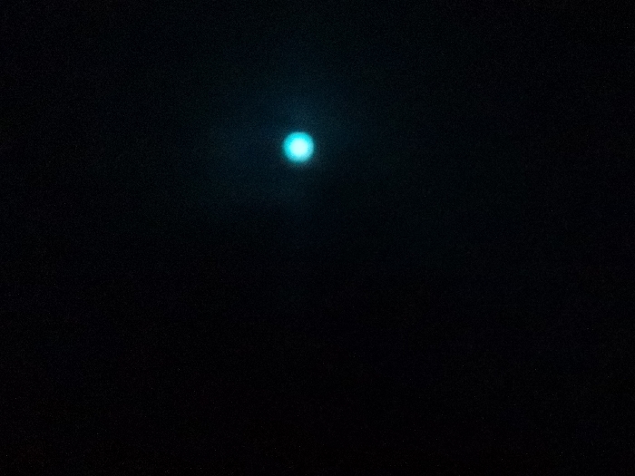 The image displays a predominantly black, featureless background, indicating a dark environment within Парэцкі сельскі Савет, Belarus. A single, blurry, circular light source is centrally positioned in the upper half of the frame. This light emits a distinct turquoise or cyan hue. No discernible people, specific objects beyond the light source, actions, or interactions are visible in the scene. The overall impression is of a lone illumination against an otherwise unlit expanse.
