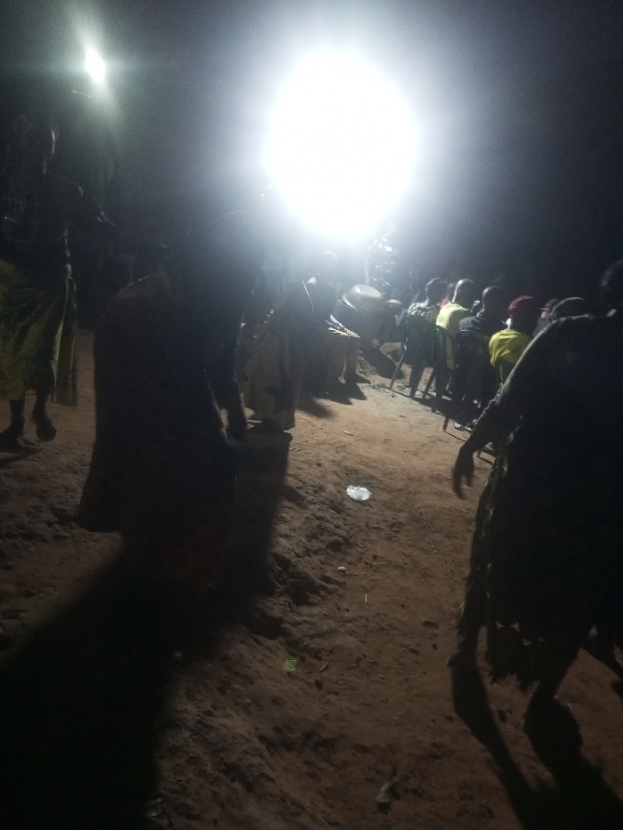 A gathering of people is seen outdoors at night, illuminated by a bright overhead light. Many individuals are seated, while others stand or move around. A drum is positioned among the seated group, suggesting a musical or ceremonial context. The ground appears to be dirt or soil, typical of a rural or less urban setting. The people are dressed in a mix of clothing, with some wearing traditional garb, potentially indicating a cultural event.