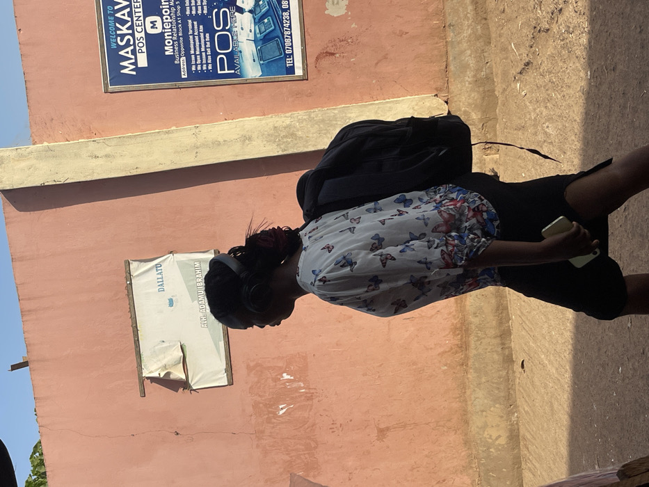 The image depicts a street scene in Samaru, Nigeria, under direct sunlight. A light reddish-brown wall, exhibiting minor cracks and variations in tone, forms the background, with a light brown ground surface visible at the bottom. A sharp, vertical shadow from an architectural column is cast on the wall, indicating overhead sun. Two signs are affixed to the wall: a partially torn white banner on the left displaying "DALLATU" and "ALH. ADAMU IBRAHIM," and a blue rectangular sign on the right advertising "WELCOME TO MASKAVEN POS CENTER" and "MONIEPOINT Business Relationship Manager" services, including a contact number. A person, appearing to be female, is captured in mid-stride, walking from right to left across the frame. She wears a white blouse patterned with blue, red, and pink butterflies, a dark skirt with a slit on the left thigh, and black over-ear headphones. A dark-colored backpack is worn on her back, and she holds a light-colored smartphone in her right hand, positioned by her side. Her head is turned slightly to the left, indicating her direction of movement and gaze.