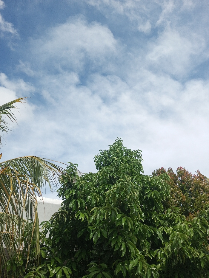 A daytime shot captures a partly cloudy sky above lush trees. The clouds are white and scattered across a blue expanse. Below, a palm tree with long, drooping fronds frames the left side. A dense, leafy tree dominates the center, displaying vibrant green foliage. To the right, another tree with reddish leaves adds a contrasting hue. A white wall is partially visible behind the palm tree.