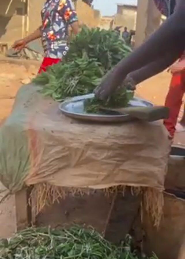 n outdoor market scene, likely in a village or rural area. A person with dark skin is seen chopping green leafy vegetables on a makeshift table covered with a tan burlap sack. The table is positioned in front of a bundle of similar vegetables tied with thin, green plant stems. The person uses a large, dull cleaver-like blade to chop the vegetables on a silver plate. Several people walk by in the background. The setting includes simple, one-story buildings with terracotta-colored walls and metal roofs. The ground is a mix of dirt and sand. The daylight indicates it is probably midday.