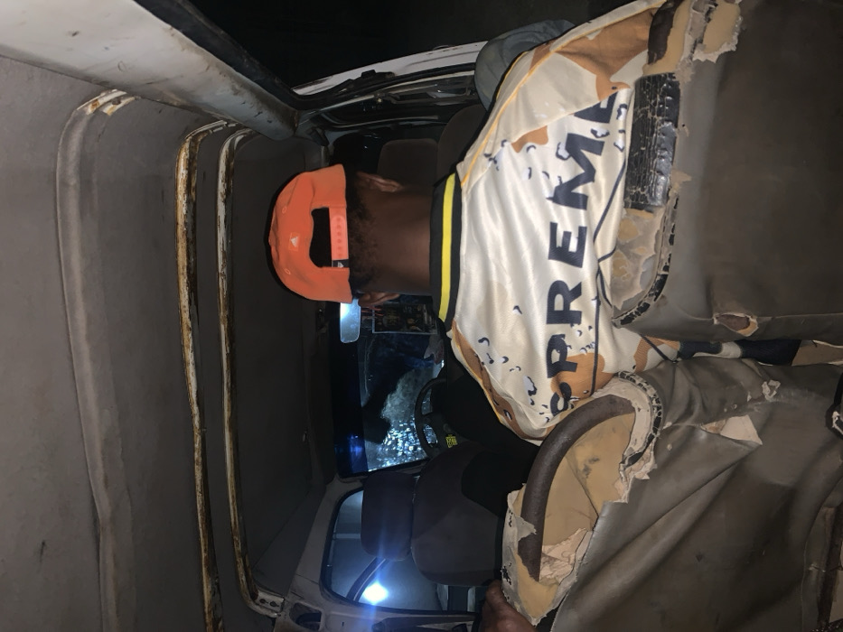 Inside a dilapidated vehicle, an orange-capped individual peers into the car's interior. A beige and tan camouflage jersey with "SUPREME" emblazoned on it is visible. The car's interior is worn, with torn and peeling upholstery on the seats. The vehicle's frame is visible due to missing panels. The steering wheel is in front of the individual. Rust is noticeable around the car's edges.