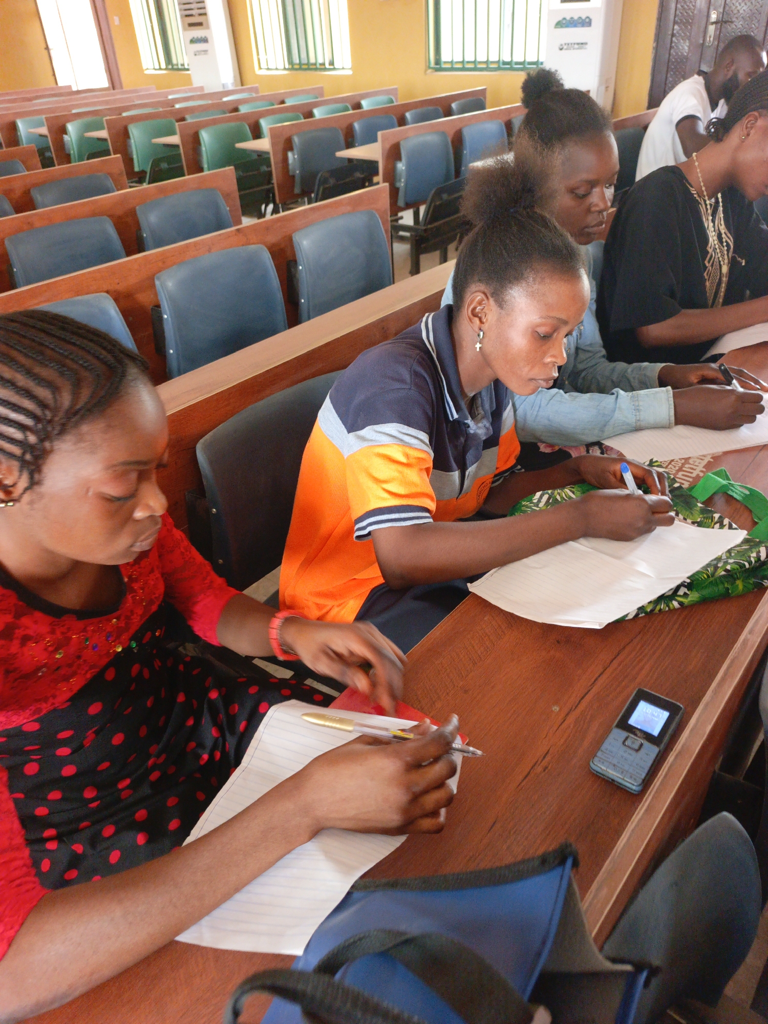 The image depicts the interior of a classroom in Akwanga, Nigeria, with multiple individuals seated at rows of wooden desks equipped with cushioned chairs. In the immediate foreground on the left, a female with braided hair, wearing a red top with embellishments and a black skirt with red polka dots, is focused on writing with a golden pen in a lined notebook. To her right, a female wearing a blue and orange striped polo shirt is actively writing with a blue pen on a white sheet of paper, which rests on a green fabric item with a white and black pattern. A small blue feature phone, displaying "10:41", is positioned on the desk to her right. Further back, another female, mostly obscured, is also writing. In the mid-ground, a female with dark hair styled upwards wears a light blue denim-like top and is engaged in writing. A fourth female, partially visible in the right background, wears a black top and a gold-colored necklace, also writing. In the far background, a male figure in a white t-shirt stands. The classroom features yellow walls, windows with green vertical blinds, and a white wall-mounted unit displaying text and logos. The desks are made of polished wood, and the chairs feature blue and green cushioned seats.