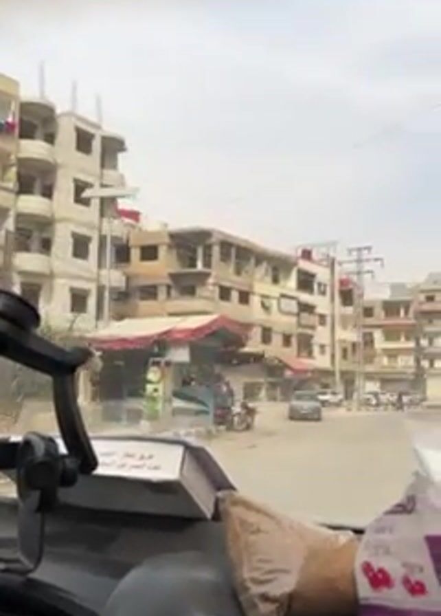 The view is from the inside of a vehicle, likely a car, looking out through the windshield. The car is at an intersection in what appears to be a Middle Eastern town. Several buildings of varying heights are visible, appearing to be made of concrete or similar materials, some looking incomplete or damaged. The sky is overcast, with a general sense of dustiness in the air. In the foreground, inside the car, there is a dashboard with a phone mount and some loose items. Outside, people are seen riding a motorcycle. There is also car and other motorcycles going through the intersection. There are also electric poles and wires visible in the background.