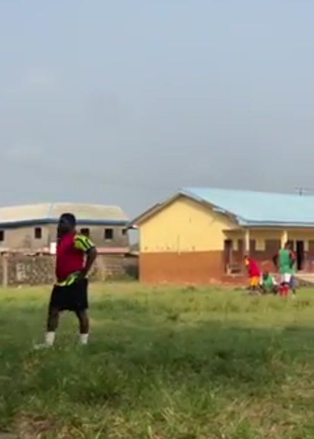 grassy field on a sunny day. In the background, there are buildings with light-colored roofs and brown and yellow walls. In the foreground, several men are wearing athletic attire including red, green, and yellow tops. Some of the men are standing while others are huddled over a tire. One man is standing off to the side.