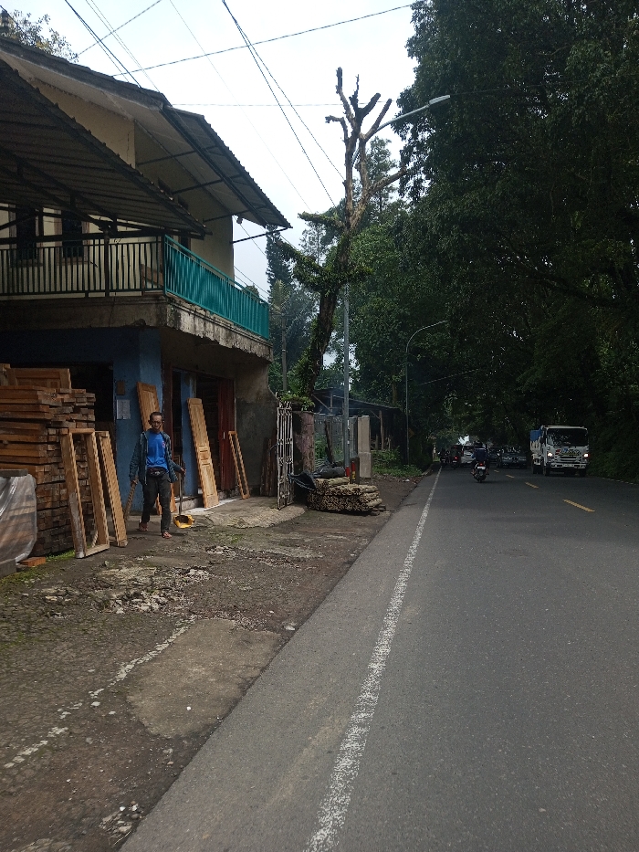 A two-story building with a blue awning and wooden frames stacked beside it stands next to a road. A man with a broom walks near the building. The road has a white line marking the edge. Cars, trucks, and motorcycles travel along the road. A tall, bare tree and lush green trees line the roadside. Power lines stretch across the sky.