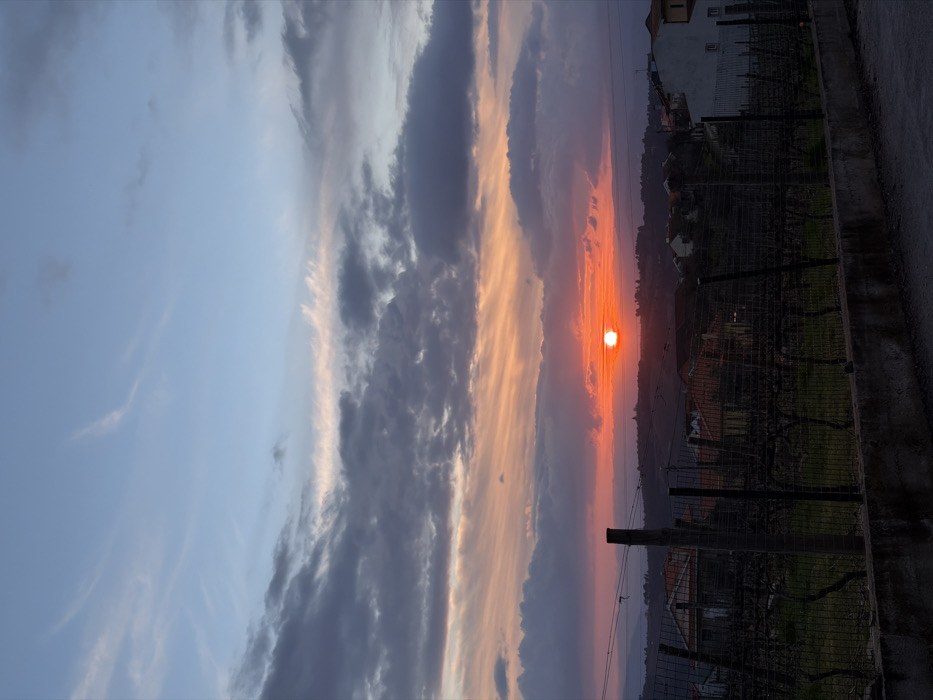 The image displays a panoramic view of a sunset over the city of Peso da Régua, Portugal, specifically facing westward. The sky occupies approximately two-thirds of the frame, segmented by cloud formations and color gradients. The upper section features a clear light blue sky with faint, wispy cirrus clouds. Below this, a horizontal band of dark grey, dense clouds spans the mid-sky, contrasting with streaks of orange, pink, and pale yellow light diffused horizontally across the middle ground of the sky. The setting sun, a distinct, bright orange-red orb, is centered just above the horizon in the lower mid-right quadrant, radiating intense red and orange light across the lower atmospheric layers. Below the solar disc, the landscape consists of undulating hills and valleys, indicative of the Douro wine region, populated by what appear to be dormant vineyards with bare vines. Scattered residential buildings with reddish-brown tiled roofs and white or light-colored facades are visible throughout the midground, integrated into the hilly terrain. In the foreground, a dark, vertical wooden post is prominent on the left. A dark mesh fence extends horizontally across the lower quarter of the image, running from left to right. Behind this fence, rows of trellised, bare grapevines are discernible, with some green ground cover visible between the rows. Directly beneath the fence, a dark concrete or stone wall forms a boundary, with a dark, possibly paved, surface visible at the absolute bottom edge of the frame. No human figures are present within the scene.
