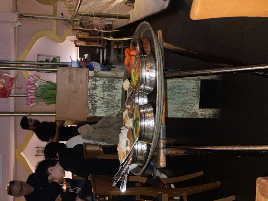 An Indian thali, laden with small bowls of various dishes, dominates the foreground. Silverware extends from the thali, positioned near several chairs. Behind the thali, people are seated at tables. A vase of tulips stands on a distressed wooden cabinet. The restaurant interior features ornate pink wall designs.