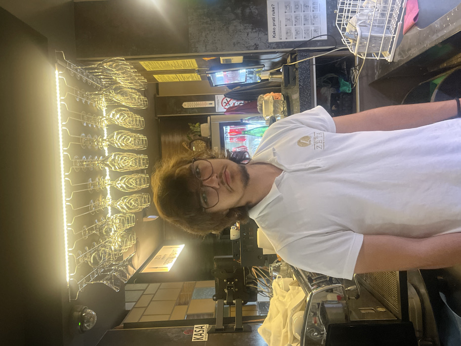 The image depicts the interior of the Zeta Restaurant, located in Budva, Montenegro. A male individual, appearing to be an employee, stands centered in the frame behind a bar or counter area. He has medium-length brown hair, wears dark-framed glasses, and has light facial stubble. He is dressed in a white short-sleeved polo shirt with a dark collar, featuring the "ZETA RESTAURANT" logo on the left chest. His expression is neutral as he faces the camera directly. Above him, a metal rack holds approximately 16-18 inverted wine or cocktail glasses. A strip of LED lighting illuminates the glassware. A small, dark dome-shaped security camera is mounted on the ceiling in the upper left corner. To the left of the individual, a stainless steel espresso machine is visible on a dark countertop, partially covered by a white cloth. A white sign with "KASA" (Cash Register) in black lettering is affixed to a dark panel behind the counter. Further left, a wall section with light-colored rectangular tiles is discernible. To the right, the counter extends, displaying a tall, narrow thermometer on a dark wall. Below it, a "No Smoking" sign is present. A digital display or monitor is also visible. Bottles, including red and green varieties, are partially seen within a refrigerated unit behind the counter. A white document titled "Kako prati ruke?" (How to wash hands?) with illustrative diagrams is taped to a vertical surface. A white plastic dish drying rack containing various items sits within a sink or basin area on the far right, next to a pink cloth. The overall environment appears to be a functional service area within a restaurant.