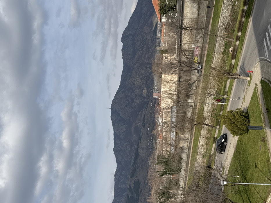 The image displays an urban landscape in Sliven, Bulgaria, with the Sinite Kamani mountain range forming the background