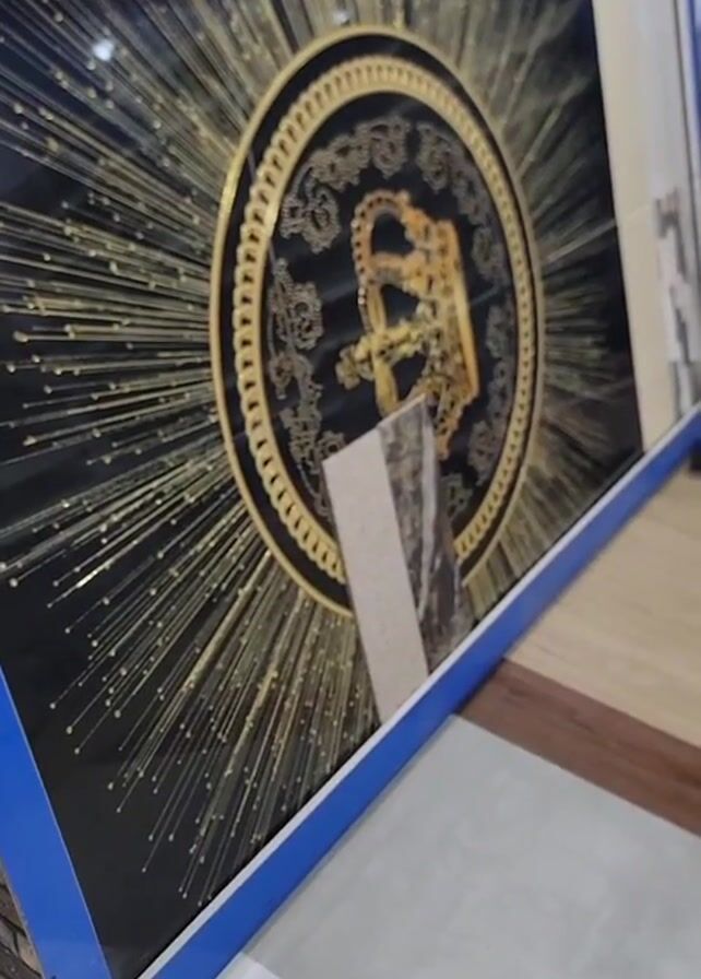 showroom with various tile samples. A large decorative tile with a black background, gold accents, and a radial design is on display in a blue frame. The camera pans to the right to show a wall display with numerous tile samples of different colors, patterns, and textures arranged on shelves. There are pink plastic tubs and gray metal trays on the floor near the tile display. A section of flooring made of wood-look tiles is also visible.