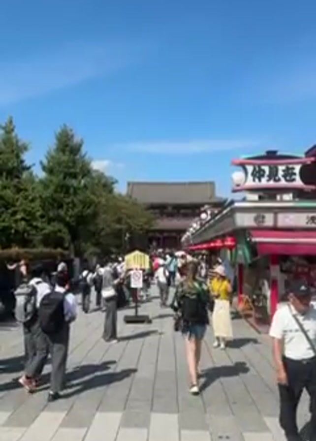 street leading towards a large, traditional Japanese building, likely a temple, on a sunny day with a clear blue sky. The street is paved with light-colored stone and is crowded with people of various ages and ethnicities, many of whom are tourists, some carrying backpacks or umbrellas. On the right side of the street, there are small shops with red awnings and traditional Japanese lanterns. A yellow sign with Japanese writing stands on the left side of the street. Trees are visible on the left of the frame. People are walking towards the temple, creating a busy atmosphere.
