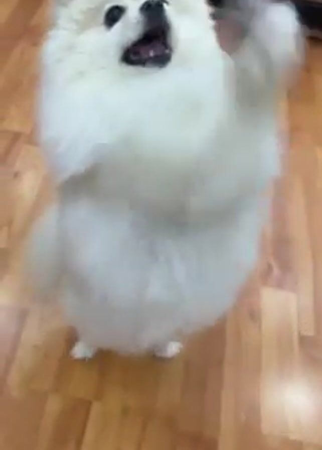 A small, white, fluffy dog stands on its hind legs on a wooden floor. Its front paws are raised in the air. The dog has an open mouth and is looking upwards. An indistinct voice speaks in the background.