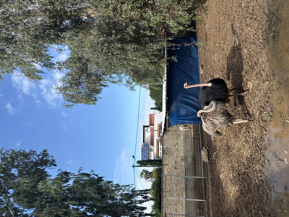 The image captures an outdoor scene identified as being in Nahariya, Israel, under a clear blue sky with scattered white clouds. The primary subjects are two ostriches standing on a muddy, uneven dirt ground with visible puddles. One ostrich, predominantly dark-feathered with a long pink neck, is positioned to the right, facing right. The second ostrich, with lighter brown and grey feathers, stands slightly to the left and behind the dark ostrich, facing left. No people are visible. In the midground, to the left, a metal mesh fence encloses an adjacent area where a large, dark-shelled tortoise rests on the ground. Partially obscured behind the fence and a stone wall, a light-colored animal, possibly a goat or sheep, is faintly visible. To the right, a rudimentary shelter structure, covered with a blue tarpaulin, stands on the edge of the enclosure. The background reveals a multi-story residential building with a red tiled roof, featuring solar panels. A white street lamp post is visible near the building. Electrical wires traverse the upper midground. The scene is framed on both sides by tall, leafy trees, consistent with eucalyptus, whose branches extend into the upper portions of the frame. No discernible actions beyond standing or resting are observed, and no interactions between the animals or with humans are apparent.