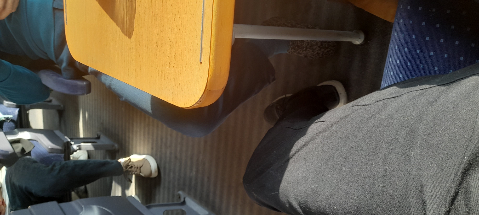 The image displays the interior of a public transport vehicle, likely a train carriage or intercity bus, operating within or departing from/arriving at a station in Sofia, Bulgaria. The perspective is from a seated position, looking forward and slightly to the right. In the immediate foreground, the observer's legs are visible, clad in dark gray trousers and dark athletic shoes with white soles. To the right, a light-colored wooden table with rounded corners and a white metal support leg occupies the mid-ground. Another passenger is seated beyond this table, with their lower legs visible wearing blue jeans. One foot, partially obscured by the table leg, wears a dark, patterned slipper-like shoe. A portion of their upper torso, dressed in a teal or blue-green long-sleeved garment, is also visible behind the table. In the background, further down the aisle to the left, a third passenger's legs are visible, wearing dark jeans and light tan sneakers with white soles. The vehicle's floor is dark gray with a horizontal ribbed pattern. Blue upholstered seats with a subtle square pattern and gray plastic frames are visible throughout the scene. Natural sunlight from an unseen window casts distinct shadows across the floor and on the visible individuals and objects. All visible individuals are in a seated, stationary position.