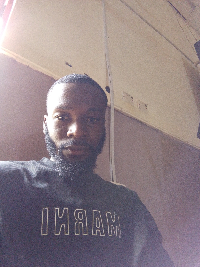 An adult Black male is depicted in a chest-up selfie taken indoors
