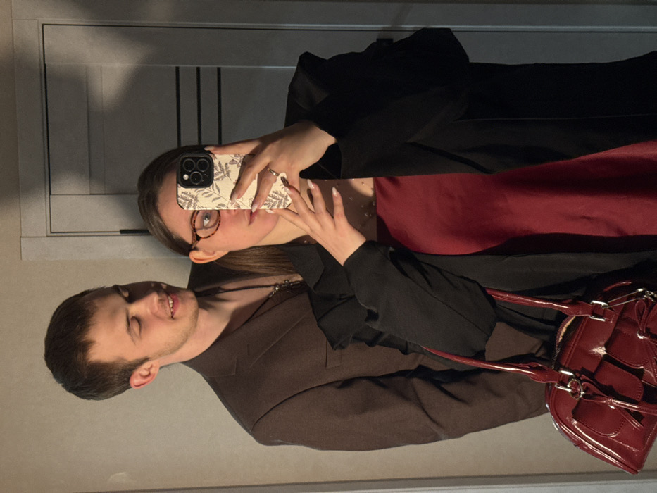 A selfie features two people in formal attire