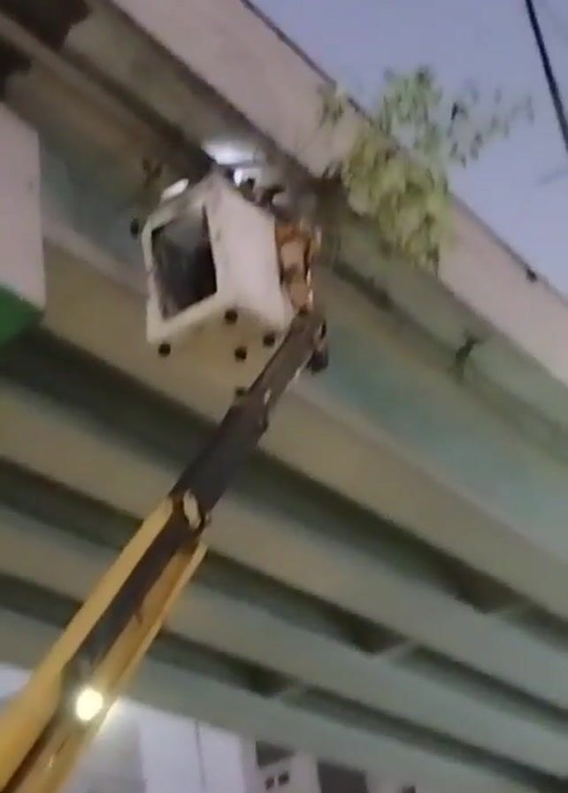yellow crane with a white bucket extended towards the underside of an elevated roadway. The bucket is positioned near a small patch of foliage growing from a crack in the concrete structure. A street light is visible in the background against the blue-grey sky. The video is shot from below, looking up at the crane and the bridge. There are several buildings visible in the distance, with lights on in some windows. The crane appears to be in operation, potentially for maintenance or vegetation removal on the overpass.