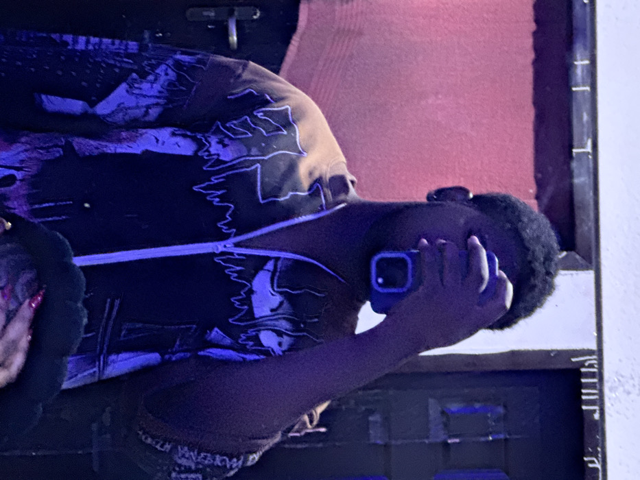 An individual with dark skin and short, dark, curly hair is depicted indoors in Asipa, Nigeria. The person, appearing male, wears a dark, possibly brown or black, long-sleeved zip-up jacket adorned with white and light blue graphic designs featuring abstract or cartoonish elements. A light-colored zipper runs down the front. A silver-colored stud earring is visible on the subject's left earlobe. The person holds a blue-cased smartphone in their right hand, covering the face from the eyes downward. Below the main subject's right arm, a hand with long, red-painted fingernails is visible, grasping a dark, possibly textured object. The background consists of a reddish-pink wall or curtain on the left and a dark doorframe with faint vertical markings on the right. The scene is dimly lit with a predominant purplish-red hue.