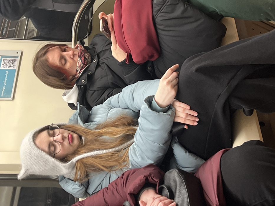 Two women are sitting next to each other on public transportation, likely a train. The woman in the foreground, with glasses and a cat-ear hat, appears to be sleeping. The other woman is awake, looking at her phone. Both women are wearing winter clothing, including puffy jackets and scarves. A maroon bag is visible. The setting appears to be cramped and potentially crowded.